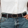 A timeless leather belt fastens with a sleek oval buckle and tapered end. Outfit, complete.