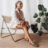 The Esther Heeled Sandal: take a tape measure and wrap it around your ankle, above the ankle bone, as that is where the strap will sit (see product imagery and fit video for a visual demonstration). This measurement is based on the last adjustment point on the strap.